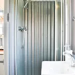 Zur Ausstattung des Badezimmers gehören auch eine Dusche. Badelaken sorgen für zusätzlichen Komfort.